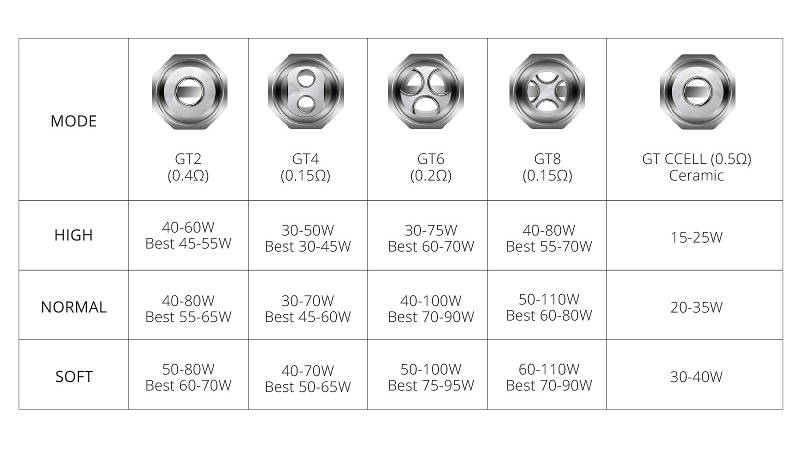 Pour cette GT-CCELL Vaporesso recommande des puissances d'utilisation comprises entre 25 et 35 W.
