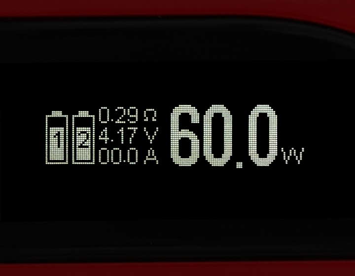 Le grand écran de 0,91 pouce indique de façon claire les principales informations : niveau de charge de chacun des accus, valeur de la résistance, valeur du réglage de puissance (VW) ou de la température (TC).On dispose également d'informations secondaires comme le voltage utilisé, l'intensité (en Ampères) requise par la box lors de la bouffée, le compteur de bouffées ou la durée totale des bouffées.Sur le plan de l'écran, on regrette un peu qu'Eleaf ait privilégié l'esthétique à la lecture de l'écran. En effet la belle plaque de protection fumée rend la lecture difficile, voire très difficile en plein soleil. Cela ne nous a pas vraiment géné car on ne modifie finalement pas beaucoup les réglages de la box pendant la journée.
